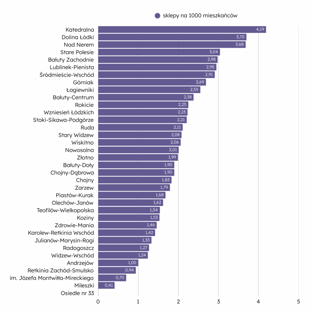 - Wyraźnie wyższe wskaźniki punktów sprzedaży na 1000 mieszkańców w centralnych osiedlach