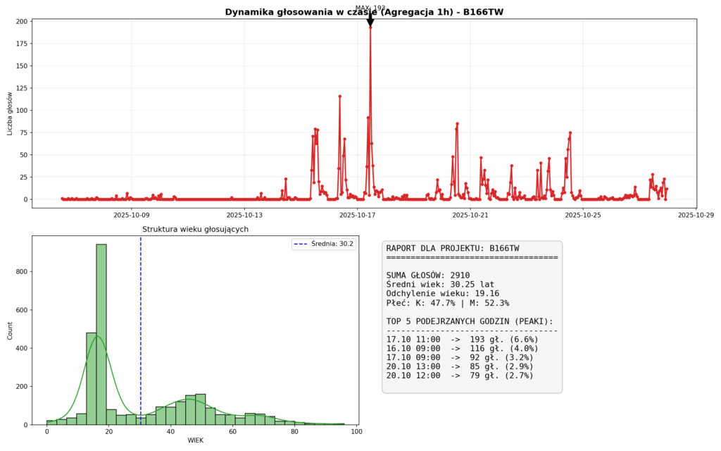 To jest „kropka nad i” całego śledztwa. Ten wykres (histogram wieku w lewym dolnym rogu) jest wręcz podręcznikowym dowodem na to, że głosy nie były oddawane z własnej woli, a w ramach zorganizowanej akcji.