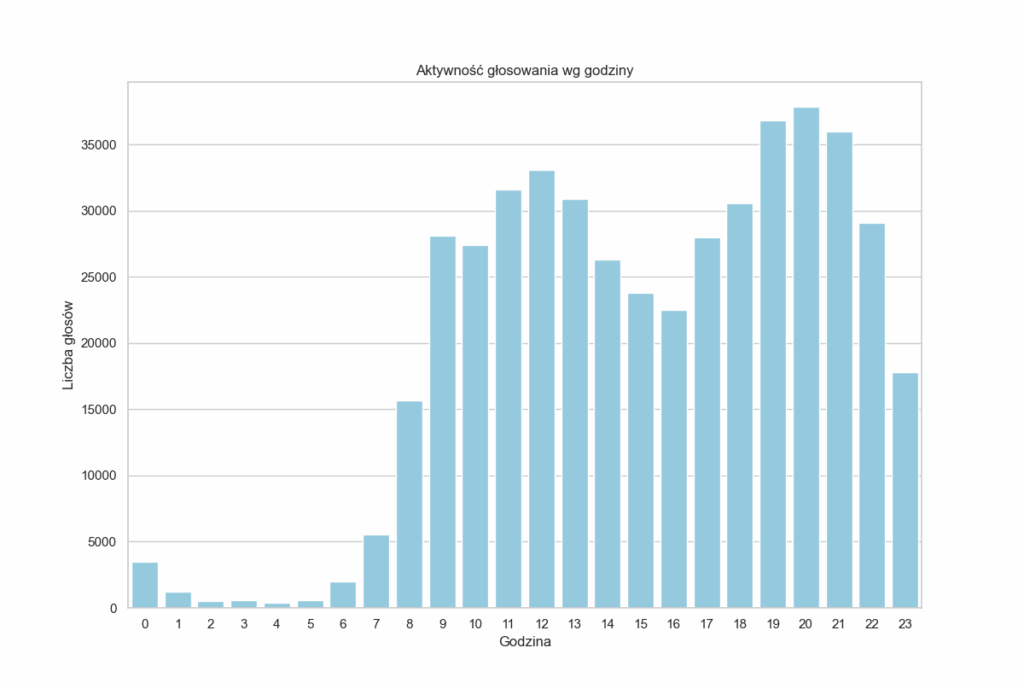 Mimo silnej presji instytucjonalnej w ciągu dnia, najwięcej głosów wpada wieczorem. Szczyt przypada na godziny 19:00–20:00 (ponad 37 tys. głosów). To dowód na to, że „zwykli” mieszkańcy, niezależni od szkolnych dyrektyw, siadają do komputerów po pracy i kolacji, by oddać swój głos.