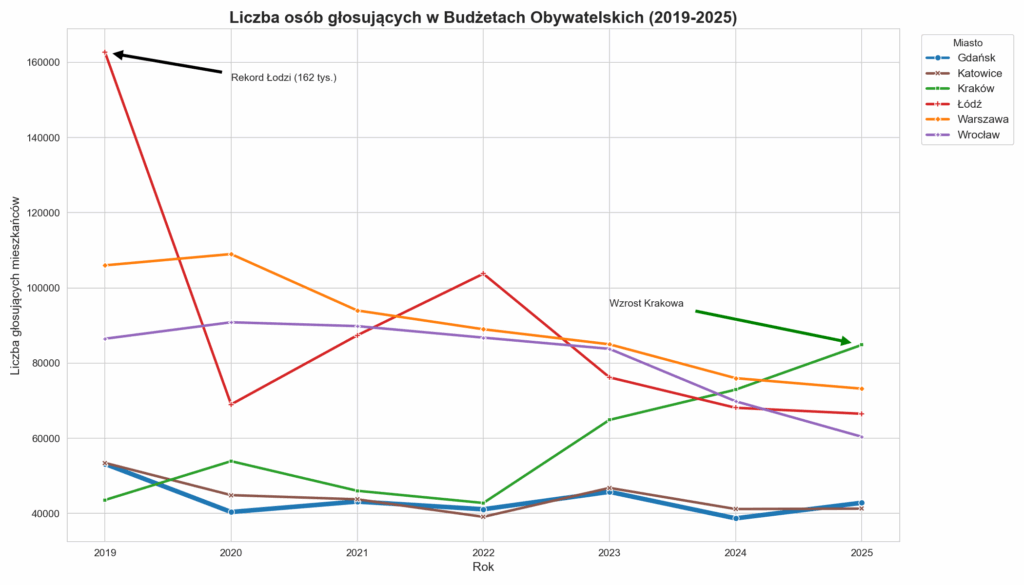- Zmiana lidera: Podczas gdy Łódź entuzjazm do BO maleje, Kraków (zielona linia) notuje niesamowitą mobilizację, podwajając swój wynik z 2019 roku i osiągając w 2025 roku pułap prawie 85 tysięcy głosujących.