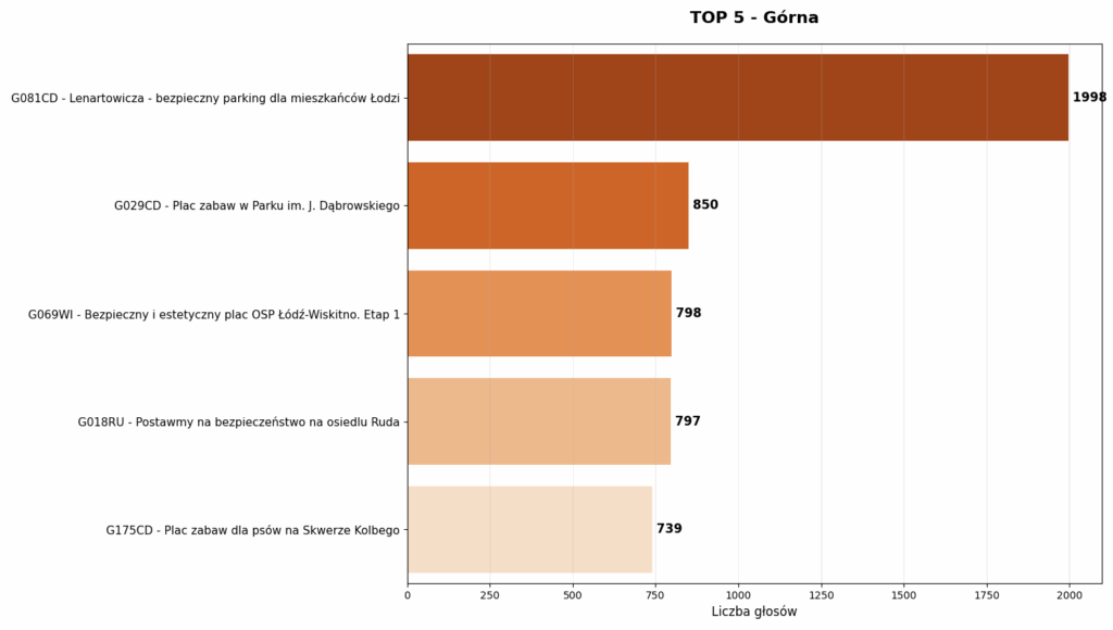 Na Górnej bezapelacyjnie wygrywa motoryzacja. Projekt G081CD (parking przy ul. Lenartowicza) zdobył prawie 2000 głosów, deklasując place zabaw i skwery.