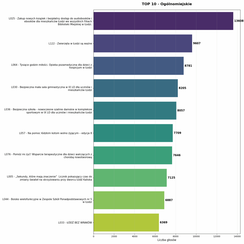 Bezdyskusyjnym zwycięzcą całego BO 2025 jest projekt L025 – zakup nowości książkowych i audiobooków dla bibliotek. Zdobył on miażdżące 13 608 głosów. To wynik, który pokazuje siłę „lobby bibliotecznego” – wiernej, ogromnej grupy mieszkańców, która rok w rok mobilizuje się, by dofinansować filie miejskie. Tuż za nim plasuje się projekt dla zwierząt (L122).