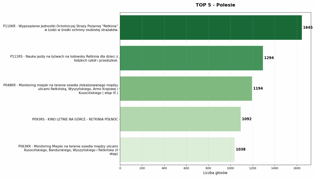 Tutaj wyniki są o połowę niższe niż na Bałutach (zwycięzca ma 1645 głosów). Wygrywa straż pożarna z Retkini (P110KR), a tuż za nią lodowisko i monitoring.