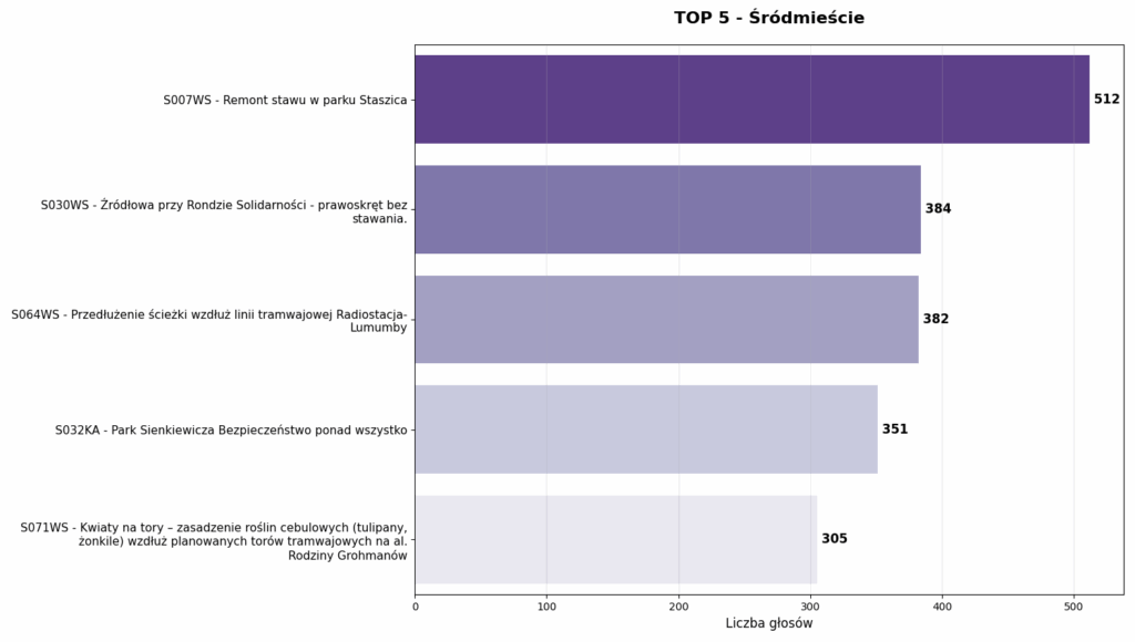 Śródmieście to specyficzna dzielnica. Zwycięski projekt (S007WS – Remont stawu w parku Staszica) zdobył zaledwie 512 głosów. To przepaść w porównaniu do 3000 głosów na Bałutach.