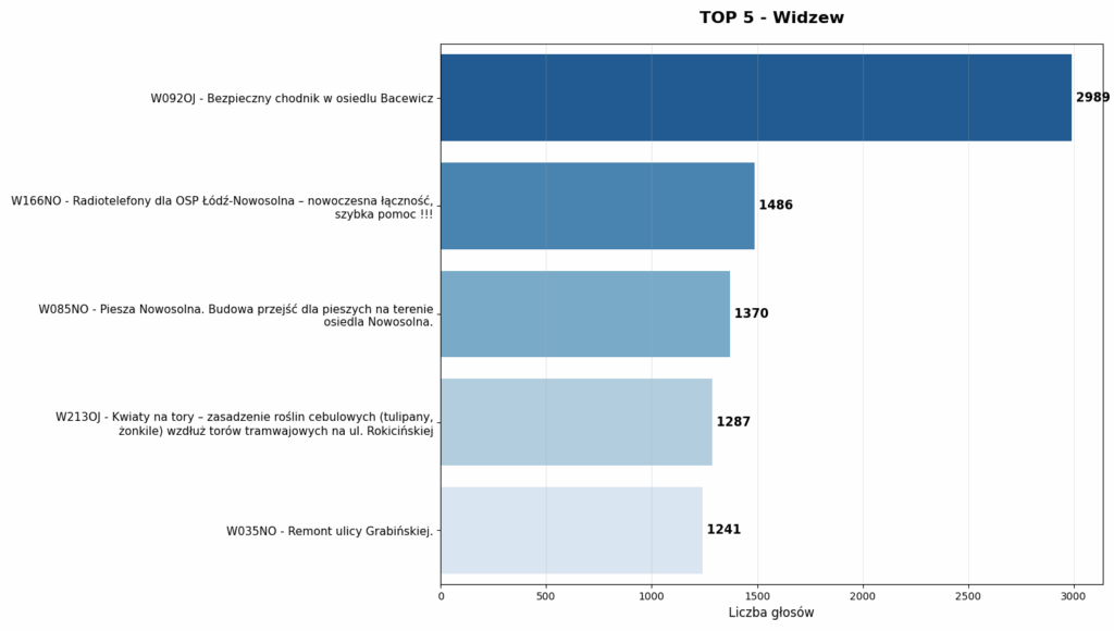 Na Widzewie mamy absolutnego dominatora. Projekt W092OJ (Bezpieczny chodnik w osiedlu Bacewicz) zdobył prawie 3000 głosów, dwukrotnie przebijając drugie miejsce. Takie poparcie dla kawałka chodnika w naturalnych warunkach jest ewenementem.