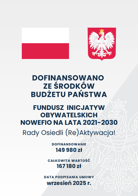 Zadanie jest współfinansowane w ramach realizacji wniosku „Rady Osiedli (Re)Aktywacja!” w programie NOWEFIO ze środków Narodowego Instytutu Wolności – Centrum Rozwoju Społeczeństwa Obywatelskiego.